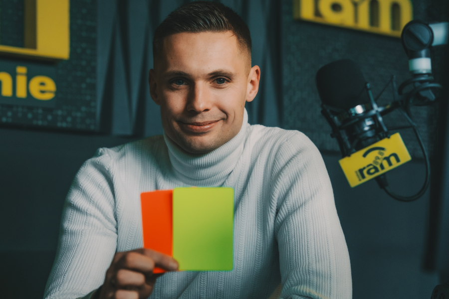 Oj, o kolorach nie będę dyskutować. Dla mnie to jest czerwona kartka i na pewno ma wyrazisty kolor, widoczny z daleka. Sędzia nie ma mikrofonu i komunikuje się gwizdkiem, mową ciała oraz żółtymi i czerwonymi kartkami. One muszą być wyraziste.