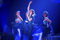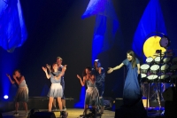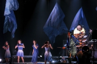 Zaczęło się od dużej ilości niebieskiego płótna przykrywającego różne kształty na scenie. Jedno z nich się podnosi, dobywa się dźwięk ludzkiego głosu, po chwili niebieskości wędrują do góry (scenografia koncertu to fenomenalny przykład jak stosunkowo niewielkim nakładem środków można stworzyć fascynujące widowisko, wystarczy pomysł), wyłania się zespół. Nietypowy skład: wokal prowadzący, trzyosobowy chórek, instrumenty perkusyjne, perkusja i instrumenty klawiszowe. I w pewnym momencie bębny dla wszystkich: